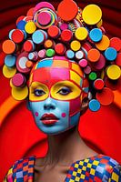 "Dotted Queen of POPART" is een levendig portret in popartstijl dat de kijker meeneemt naar een wereld vol kleur en expressie. In dit kunstwerk staat een dame centraal, waarvan het gezicht op een uitbundige en gedurfde manier is opgemaakt. Haar ogen zijn beschilderd met twee grote gele vlakken die schitteren als zonnestralen, waardoor haar blik onmiddellijk de aandacht trekt en een aura van energie uitstraalt.