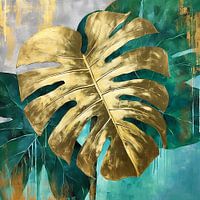 Dit blad, plat maar uiterst expressief, brengt een gevoel van verwondering over de rijkdom van de natuur. Met zijn junglepunk-esthetiek en gouden en turquoise tinten, wekt het kunstwerk een gevoel van nostalgie op.