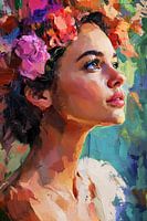 Expressieve Kleuren en Bloemen - Dit vrouwenportret schilderij kenmerkt zich door een jonge vrouw met een levendige bloemenkrans, vastgelegd in levendige, dikke verfstreken en een spectrum aan heldere kleuren die haar gezicht en de bloemen extra accentueren.