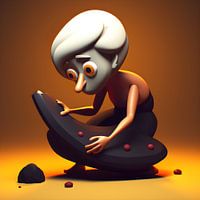 De peinzende houding van het stripfiguur versmelt met de kunst van het snijden, waardoor een fusie van creativiteit en introspectie ontstaat. De donkere verhoudingen voegen diepte en complexiteit toe aan de scènes die de Indiase cultuur uitbeelden, terwijl het gebruik van hoekige vormen dynamiek en energie toevoegt aan het kunstwerk.