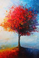 Dit opvallende kunstwerk, geschilderd met levendige en contrasterende kleuren, toont een prachtige, expressieve boom die lijkt te dansen op het canvas. De rijke rode en oranje tinten van de bladeren spatten dynamisch tegen de koelere blauwe en witte achtergrond, wat een visueel aantrekkelijk contrast oplevert. Dit stuk zou een opvallend middelpunt vormen in elke moderne woonkamer of kantoor, en is perfect voor liefhebbers van moderne kunst die een vleugje natuur en levendigheid in hun ruimte willen brengen.
