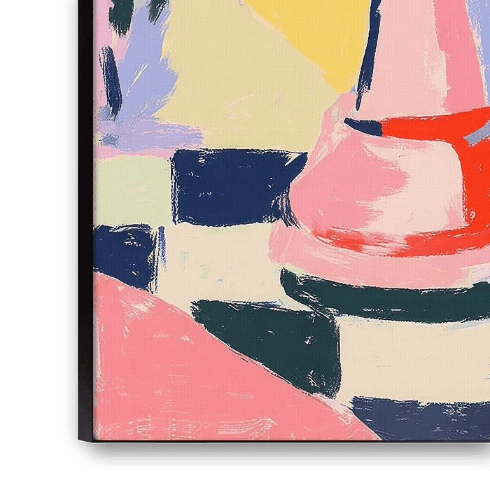 Dit schilderij toont een gestileerde schaakkoningin in het midden van een zwart-wit geblokte ondergrond. Met gedurfde, dikke penseelstreken in rood, roze en wit ziet de figuur er krachtig en energiek uit. Haar rechterarm is naar voren gestrekt, terwijl haar linker op de donkere ondergrond rust. De achtergrond bestaat uit abstracte kleurvormen in geel, blauw en roze, die beweging en dynamiek suggereren. De expressieve, gebarende schilderstijl benadrukt textuur en contrast en maakt van de koningin het duidelijke middelpunt van de compositie.