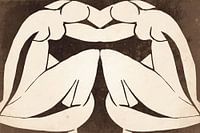 Blue Nude, een serie van ongeveer twaalf gouache-uitsneden van Henri Matisse, die mij inspireerde tot dit kunstwerk. Het toont een abstract gereduceerd zittend vrouwelijk naakt in zachte maar zeer trendy goudokerbruine kleuren op een grijze achtergrond. Hier is een naakt in abstract expressionistische stijl met twee vrouwen, twee zussen, als een verdere ontwikkeling van de organische vormen. Voor een close-up van het kunstwerk kunt u op de afbeelding klikken.