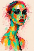 Dit krachtige portret van een vrouw straalt lef en stijl uit met felle penseelstreken in turquoise, oranje, roze en geel. De blik is intens, de kleuren rauw en levendig – een moderne ode aan expressie en vrouwelijke kracht.