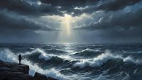 en krachtig, panoramisch meesterwerk dat de nietigheid van de mens tegenover de rauwe krachten van de natuur verbeeldt. 'The Abyssal Edge' toont een eenzame figuur op een rotsachtige klif, uitkijkend over een kolkende, duistere oceaan.