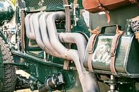 Motor- en uitlaatdetails van een Bentley-klassieker uit 1930 in British racing green.