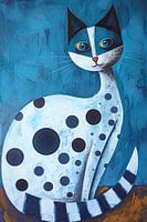 Een grillige kat met alerte blauwe ogen en een opvallend zwart-wit patroon is afgebeeld tegen een blauwe achtergrond met textuur. Haar lichaam is versierd met grote stippen en haar gezichtsuitdrukking is er een van nieuwsgierigheid.