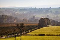 Boomgaard met het dorp Eys op een heiige ochtend met tegenlicht gezien vanaf de bosrand van het Eyserbos in het Zuid-Limburgse Heuvelland (Nederland).
