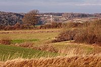 De velden van het Eyserbos met in de achtergrond een van de steilste hellingen in het Zuid-Limburgse Heuvelland, de Dodeman in het gehucht Stokhem (Nederland).