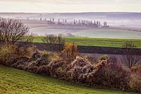 Mistige zonsopkomst bij het Eyserbos met zicht op de Cipressen bij Eyserhalte (Heuvelland, Limburg)