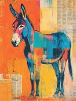 Ezel Abstract | Ezel Kleur - Op dit schilderij zie je een kleurrijke ezel tegen een achtergrond van felle, abstracte kleuren zoals oranje, blauw en geel, wat het een moderne uitstraling geeft.
