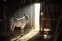 Deze sfeervolle foto toont een ezel die rustig in een oude, houten schuur staat. Door de zachte lichtinval van buiten lijkt de ruimte bijna magisch, met stofdeeltjes die door de zonnestralen dansen. De ezel staat kalm en vredig, omgeven door een rustieke sfeer die de eenvoud van het plattelandsleven uitstraalt. Het kleurenpalet van…