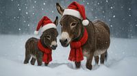 Een ezel staat met haar ezelveulen in de sneeuw. Ze hebben beiden een kerstmuts op en een kerstsjaal om. De sneeuwvlokken dwarrelen naar beneden maar ze hebben het niet koud, dit komt door hun dikke vacht en de kerstsjaal om hun hals. Het beeld is met behulp van ai gegenereerd.