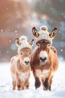 Twee schattige ezels, moeder met haar veulen, staan in een besneeuwd landschap terwijl de sneeuwvlokken naar beneden dwarrelen. Ze hebben beide een gebreide wollen muts op met een pompon er op. Ze hebben het niet koud met hun muts en dikke vacht, door hun liefde voor elkaar blijven ze ook warm. Het beeld is met behulp van ai gegenereerd.