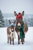 Twee schattige lieve ezels, mama met haar kindje, staan in een besneeuwd landschap terwijl de sneeuwvlokken naar beneden dwarrelen. Moeder ezel heeft een rode grof gebreide muts met een pompon op en een groene das om, het veulen heeft een blauw witte grof gebreide muts met een pompon op en een beige das om. Hun lange grappige oren…