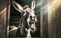 Portret van een ezel in een stal die hartelijk lacht. De foto is gemaakt vanuit mijn verbeelding met AI.