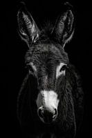 Een fascinerend portret van een ezel die boeit met zijn grote, expressieve oren en zachte blik. Het contrast tussen de donkere achtergrond en de dierlijke hoofdpersoon geeft de foto een speciale diepte. Ideaal voor in de woonkamer, het brengt een vleugje landelijke elegantie en levendigheid in elke kamer.