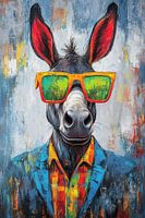 Ezel Met Zonnebril - Op dit schilderij zie je een ezel met grote oren, die kleurrijke zonnebril draagt en een blauw blazer met een felgekleurde shirt aan, wat een speelse en moderne uitstraling geeft aan het kunstwerk.