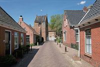 De dorpsstraat in het kleine Wierdedorpje Ezinge, in de provincie Groningen, uitlopend op de karakteristieke Middeleeuwse kerk. De foto is gemaakt in het voorjaar van 2011.