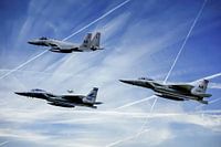 3 Amerikaanse F-15 Eagle tijdens de vlucht. Achtergrond is door de fotograaf aangepast. Foto gemaakt tijdens de Frisian Flag oefening bij vliegbasis Leeuwarden.