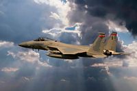 Amerikaanse F-15 Eagle tijdens de vlucht. Achtergrond is door de fotograaf aangepast. Foto gemaakt tijdens de Frisian Flag oefening bij vliegbasis Leeuwarden.