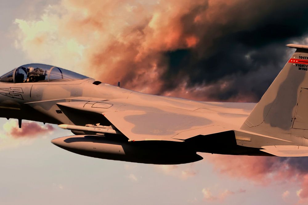 Amerikaanse F-15 Eagle tijdens de vlucht. Achtergrond is door de fotograaf aangepast. Foto gemaakt tijdens de Frisian Flag oefening bij vliegbasis Leeuwarden.