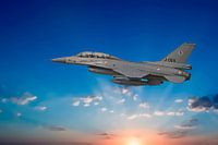 Een Nederlandse F-16 Fighting Falcon 2-seater van de luchtmachtbasis Leeuwarden tijdens een vlucht voor de Frisian Flag-oefening 2019. (De achtergrond is door de fotograaf veranderd).