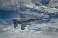 Een F-16 Fighting Falcon stijgt op vanaf de Luchtmachtbasis Leeuwarden. De F-16's worden vervangen door de nieuwe F-35 Joint Strike Fighters.