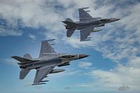 Een tweetal F-16 Fighting Falcons van de vliegbasis Leeuwarden in Nederland stijgen op voor een oefening. De F-16's worden momenteel langzaam vervangen voor de nieuwe F-35 Lightning II.