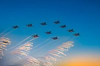 F-16 Fighting Falcon's met Flares tijdens de "Open Luchtmachtdagen" op de vliegbasis Volkel, Nederland. De Nederlandse F-16's worden momenteel vervangen door de modernere F-35.