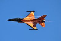 Een F-16 van de Koninklijke Luchtmacht vliegt snel voorbij tijdens een vliegshow. Het toestel is speciaal gedecoreerd met een oranje leeuw.