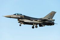 Een F-16 gevechtsvliegtuig van de Belgische luchtmacht is klaar om te landen op de vliegbasis van Kleine-Brogel. De F-16 Fighting Falcon is een eenmotorige multifunctionele straaljager die sinds 1979 veel gebruikt wordt. In onder andere Nederland en België was het de opvolger van de F-104 Starfighter. In Nederland werd tevens de F-5 door de F-16 vervangen.