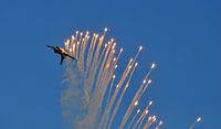 Een F-16 van de Koninklijke Luchtmacht werpt hittekogels (flares) af.