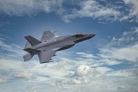 Een Nederlandse F-35 Lightning II stijgt op vanaf Luchtmachtbasis Leeuwarden. Registratienummer F-010. De F-35 Lightning II vervangt de verouderde F-16's momenteel.