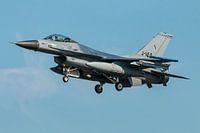 F16 in de landing op vliegbasis Leeuwarden tijdens de oefening "Frisian Flag" 2017.