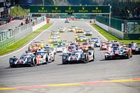 Race start van de 2016 Zes Uur van Spa van het FIA World Endurance Championship op het circuit van Spa-Francorchamps in de Belgische Ardennen. De Porsche 919 hybride racewagens leiden de Toyota TS050 en Audi R18 LMP1-auto's voor de rest van het veld van LMP en LM GTE racewagens.