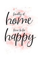 FINALLY AT HOME. TIME TO BE HAPPY. Eindelijk thuis na een lange dag op het werk? Laat de stress vallen en wees gelukkig! Modern typografisch ontwerp in de trendkleur "living coral".
