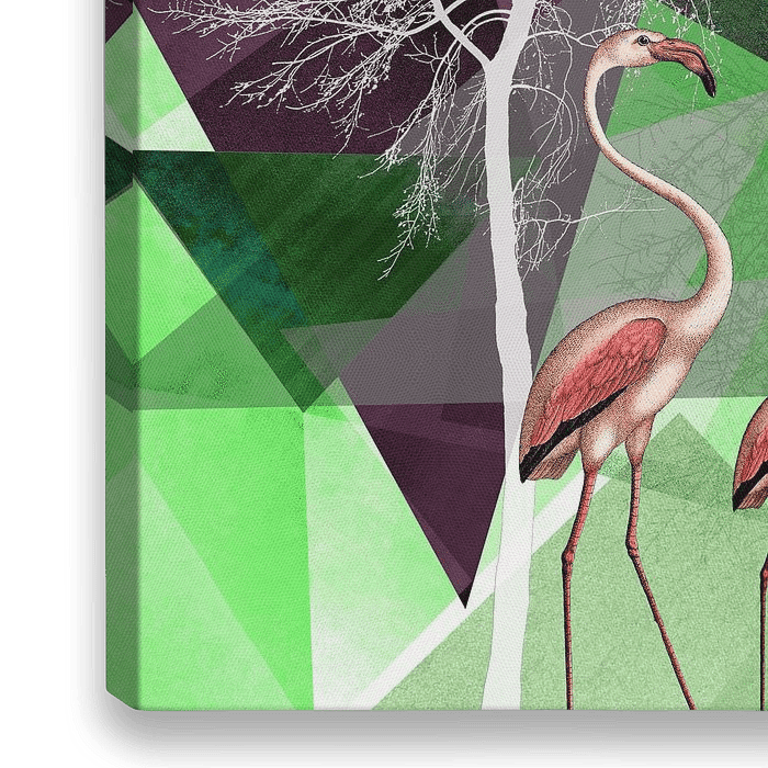 2 Flamingo's wandelen een grafische fantasie landschap, bestaande uit geometrische vormen en boom silhouetten.