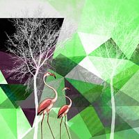 Uit mijn huidige conceptwerk: "Polygons & More". 2 Flamingo's dwalen door een grafisch fantasielandschap bestaande uit geometrische vormen en boomsilhouetten.