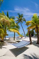 Prachtig rustig strandleven met hangmat. De verlaten scène nodigt u uit om te ontspannen. Paradijselijk uitzicht door de palmbomen naar de oceaan en de horizon.