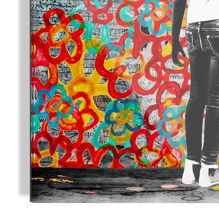 Een meisje schildert grote bloemen op een muur. Ze wil de grauwe, grijze stad opvrolijken met kleurige graffiti. Het werk is opgebouwd met verschillende lagen. Als eerste maak ik een ondergrond met stukken tekst uit tijdschriften. Dit is de basis. Daarna schilder ik de kleurige bloemen over elkaar heen met acryl verf. Vervolgens maak…