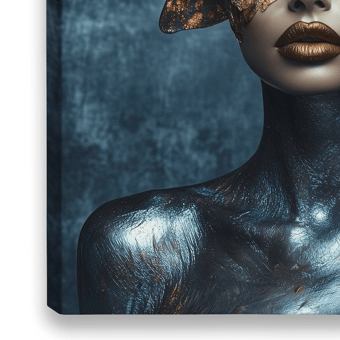 Portret van een vrouw versierd met glinsterende gouden vlinders en metallic bodypaint. Haar ogen zijn gesloten, waardoor een serene en mystieke sfeer ontstaat. De vlinders vormen een kroonachtige hoofdtooi, wat een etherische kwaliteit toevoegt.
