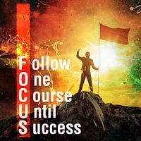 Op de voorgrond domineert een rode, transparante balk de linkeronderhelft. Het woord "FOCUS" staat verticaal geschreven in krachtige witte letters. De woorden "Follow, One, Course, Until, Success" staan verder aan de rechterkant van de balk. Samen vormen ze een inspirerende boodschap die zowel verticaal als horizontaal gelezen kan worden. Een herinnering dat focus de sleutel is tot het volgen van een duidelijke koers totdat succes is bereikt.