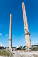 Auvelais Belgium Two chimneys stand testament amongst the rubble of the former Saint Gobain glass factory. Industry, industrial, closed, past, usine, production, facility,