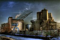 Cementfabriek aan de kade in de winter. Kraan wordt gebruikt om schepen mee te lossen en de grondstoffen gelijk in de fabriek te plaatsen.