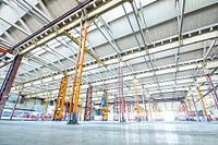Een mooie oude industriehal met felgekleurde pilaren, het licht geeft een mooie heldere diepgang en de gekleurde pilaren springen er hier uit.