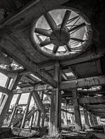 Fabrieksventilatoren van een verlaten elektriciteitscentrale.monochrome