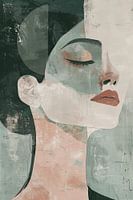 Minimalistisch portret van een vrouw in beigetinten omringd door organische vormen in groen en zalmroze. Passend bij diverse stijlen en trends. Artist: Bianca ter Riet.