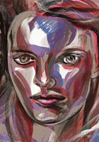 Kleurrijk vrouwengezicht met vlakken en lijnen. Portret in diepe kleuren. De gelaagdheid van het werk geeft gedachten en gevoelens weer die steeds wisselen.