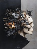Het kunstwerk toont een schedel die in het midden is gedeeld. De ene helft ziet er ruw, gebarsten en door de tand des tijds getekend uit, terwijl de andere helft begroeid is met donkere bladeren en fijne takjes. Het samenspel van botten en natuur creëert een stille, bijna poëtische spanning en staat symbool voor vergankelijkheid,…